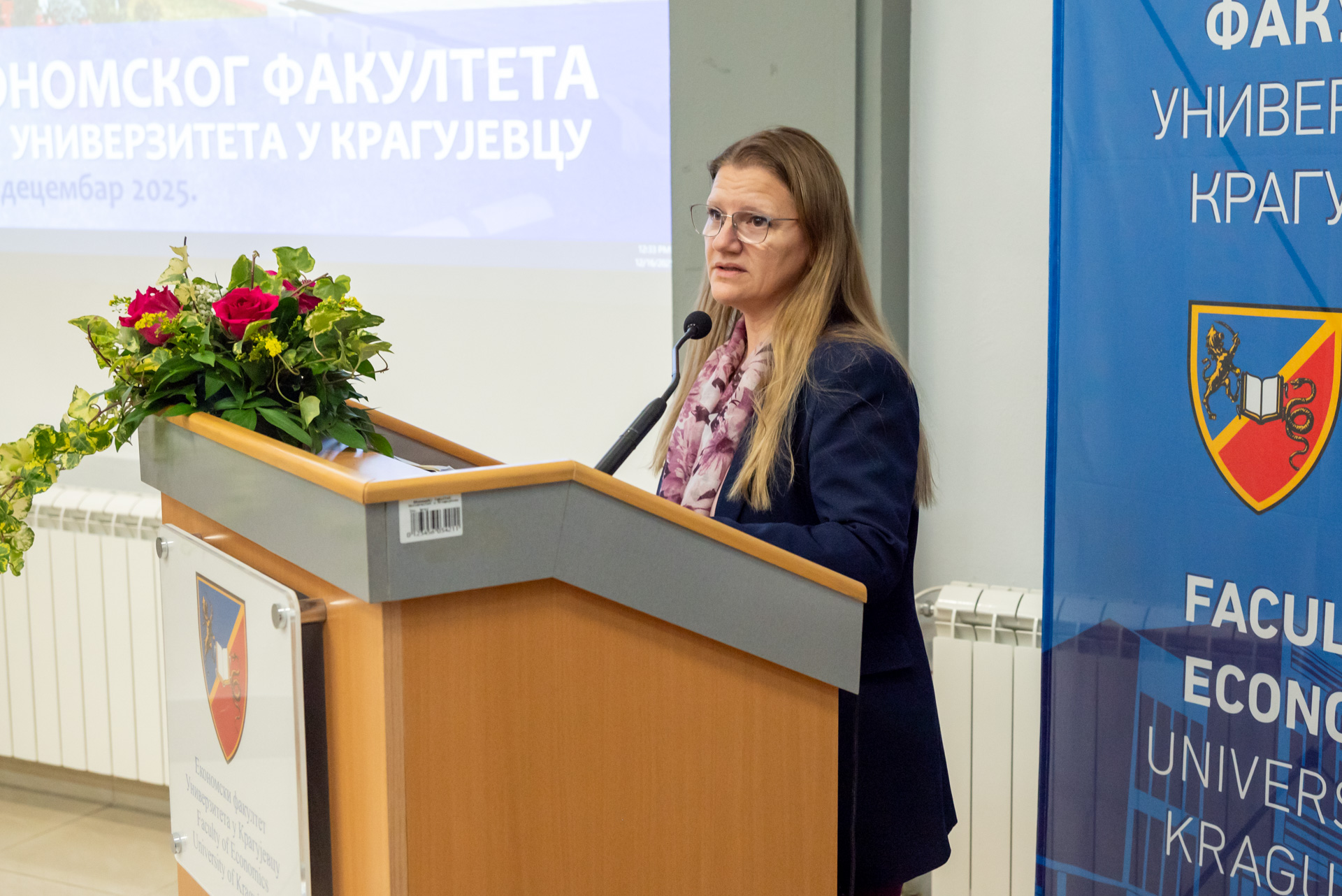Присутнима се најпре обратила деканка Економског факултета Универзитета у Крагујевцу, проф. др Милена Јакшић, која је истакла реализоване активности у претходној академској години, али и значај шест и по деценија континуираног развоја, научног и наставног рада, као и допринос образовању економиста и друштвено-економском развоју Крагујевца и Србије. Поред деканке, присутнима су се обратили и ректор Универзитета у Крагујевцу, проф. др Владимир Ранковић и заменик градоначелника града Крагујевца, господин Дејан Ружић. У име економских факултета из региона обратила се проф. др Жаклина Стојановић, деканка Економског факултета Универзитета у Београду.